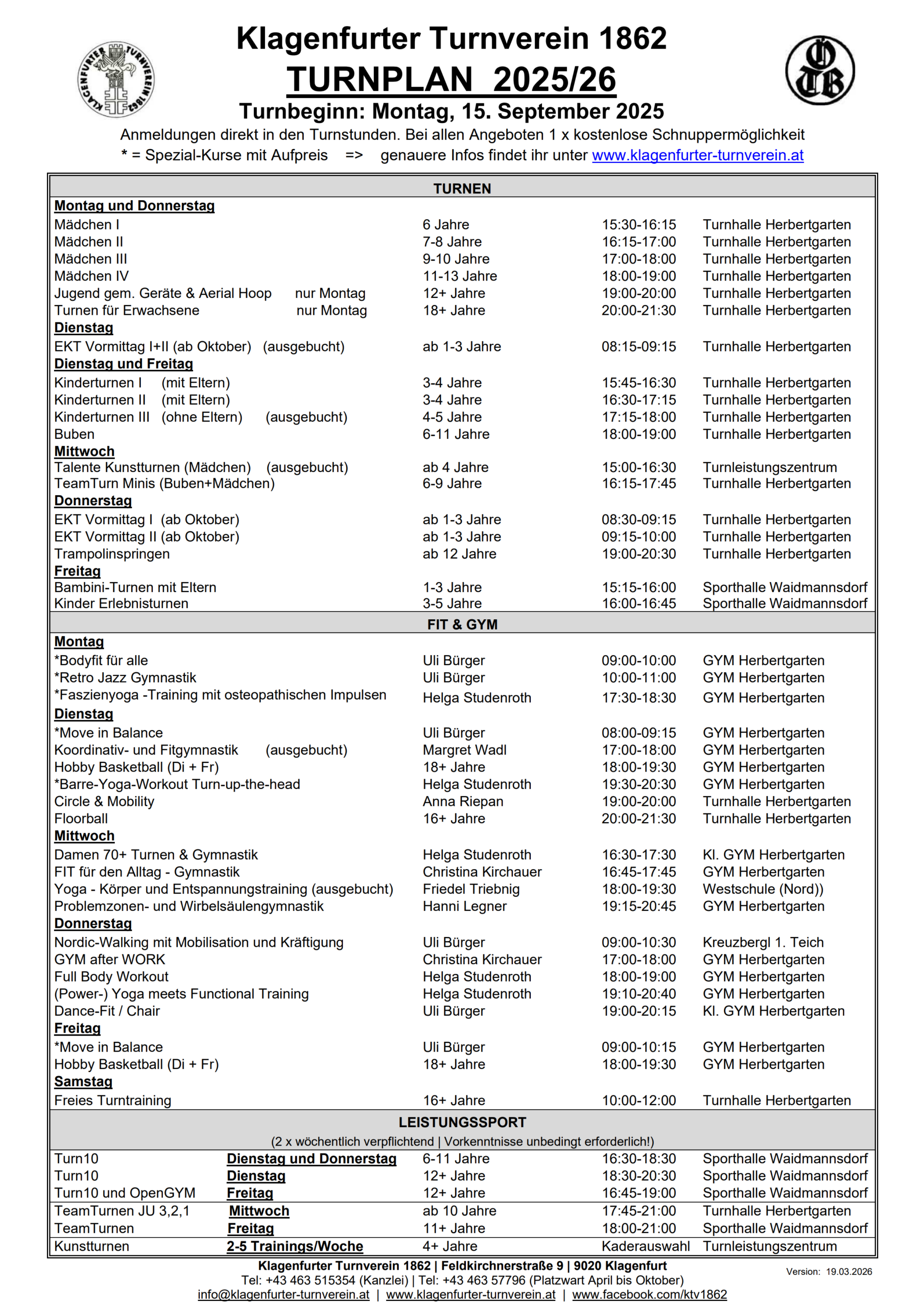 Turnstunden für Kinder und Jugendliche, Gerätturnen, verschiedene Gymnastikeinheiten, Yoga, Nordic-Walking, Akrobatik, Spiele für Jugendliche und Erwachsene.